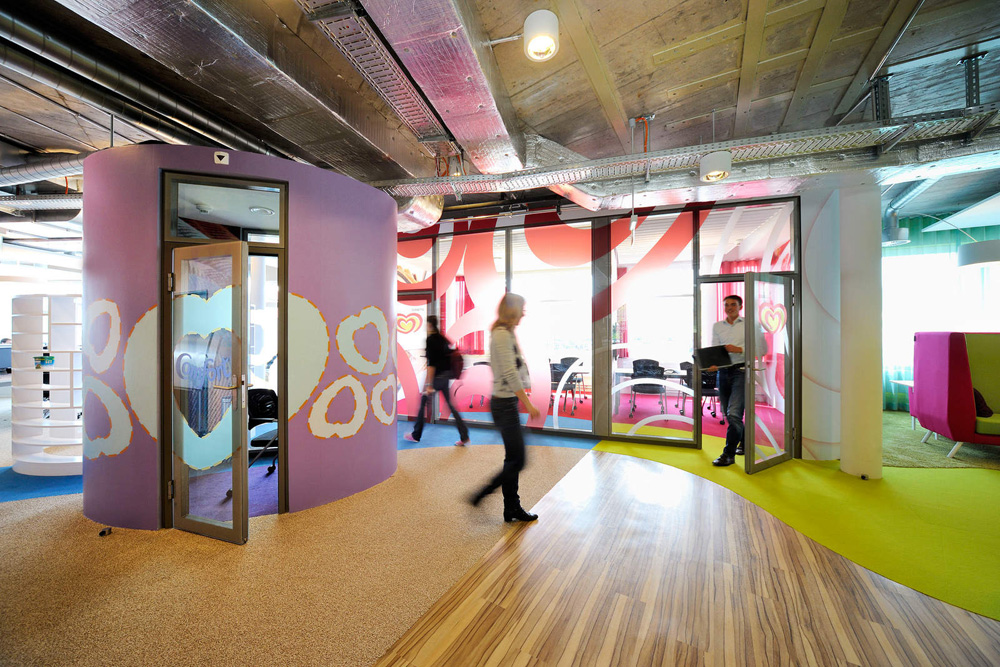位于瑞士的聯(lián)合利華辦公室,就像天朝的兒童樂園,完全是大小孩理想中的夢(mèng)想空間。色彩的明麗跳躍與碰撞讓人全然忘乎這是個(gè)本該嚴(yán)肅莊重的辦公環(huán)境。