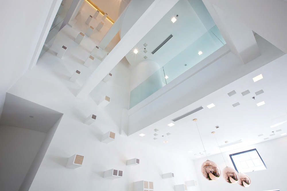這種開(kāi)放性的建筑結(jié)構(gòu)一改原先大樓結(jié)構(gòu)的弊端,使得辦公室的采光更加明亮并且加大了空間感。為了體現(xiàn)客戶開(kāi)放性的要求,在重塑結(jié)構(gòu)時(shí),設(shè)計(jì)師特別將中庭打造成一個(gè)挑空開(kāi)放的區(qū)域,不論位于哪一樓,都能方便的與每一樓層的同事溝通,并且采用長(zhǎng)型白色鋼琴漆辦公桌,即滿足了友好的工作氛圍需求又便于員工之間的交流。