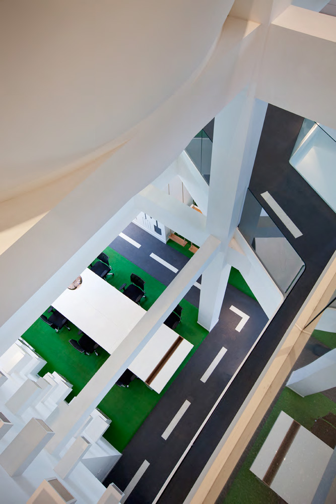 在這里,工作也似乎變得有趣輕松起來:辦公室的地面上馬路交錯, 會議室的設(shè)計以網(wǎng)球場為雛形:網(wǎng)格的玻璃隔墻,藍(lán)色的網(wǎng)球場塑膠地面,嵌著網(wǎng)球的桌子……