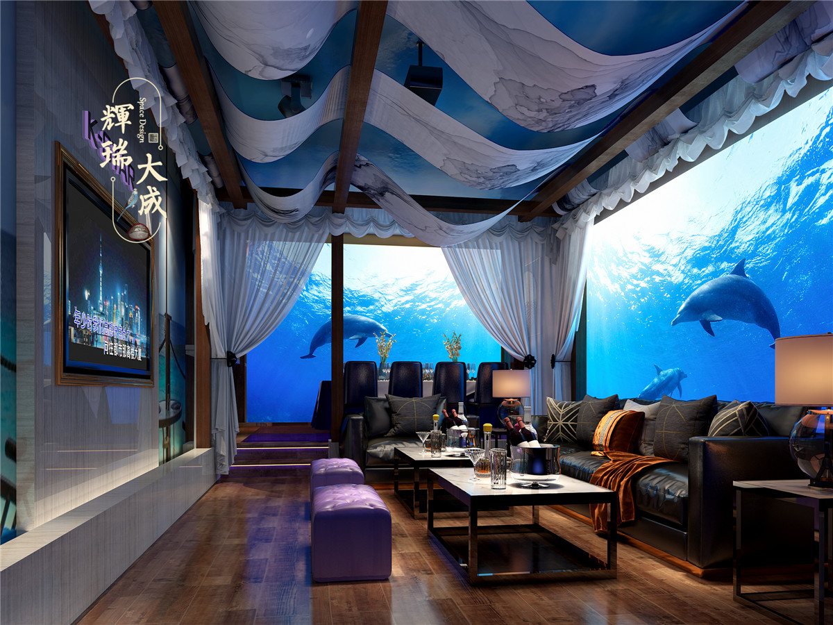 藍(lán)色海洋系包房四周的海景令人十分生喜,讓人真的好似身處海洋世界之中,大大的境遇,成群的海域,整個(gè)空間的色調(diào)是海的藍(lán)色,上方條帶造型類似浪花一樣,反射出海的魅力。