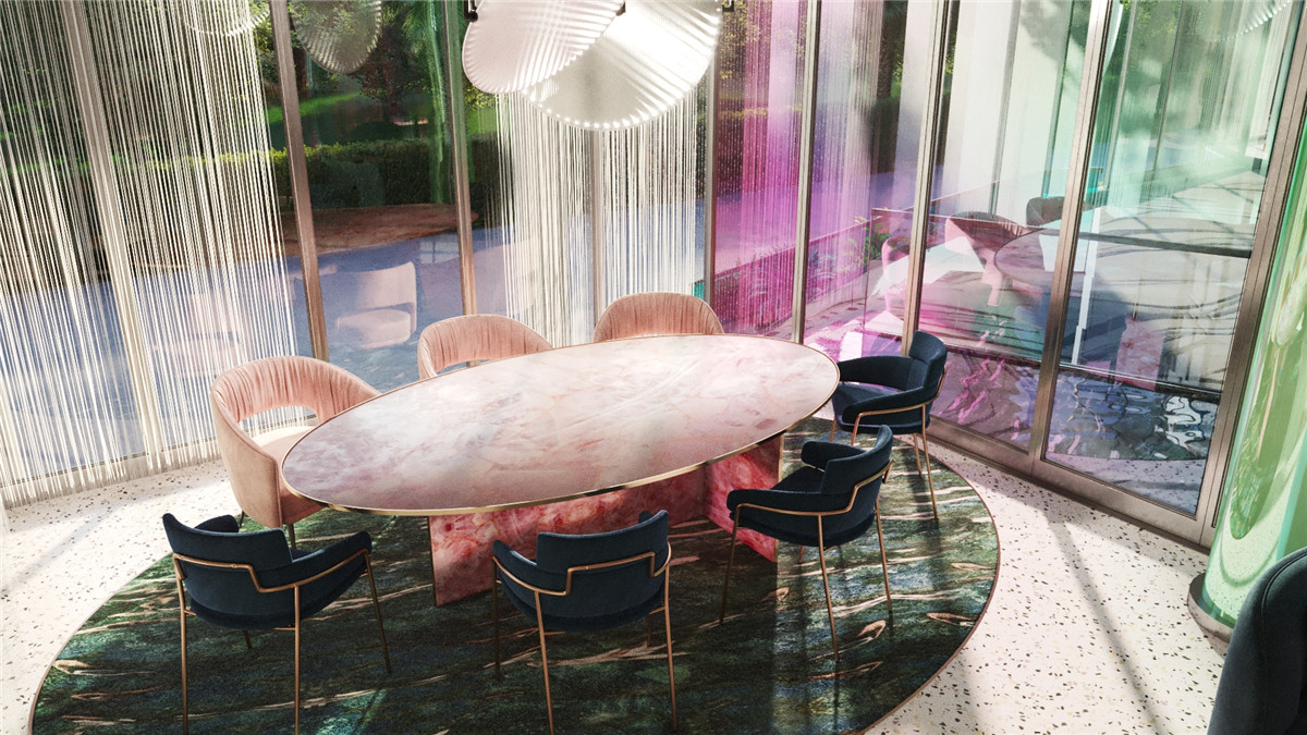 有機(jī),幾何形狀和顏色放置在大廳中,參考珠寶,并以淺灰色墻壁的簡(jiǎn)約背景呈現(xiàn)。光線通過帶有二向色性薄膜的玻璃墻和元件反射和衍射,這定義了顏色的折射并引起了不斷變化的光線,同時(shí)增加了意想不到的藝術(shù)感。