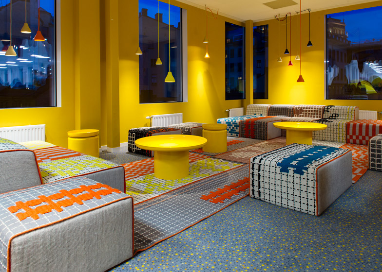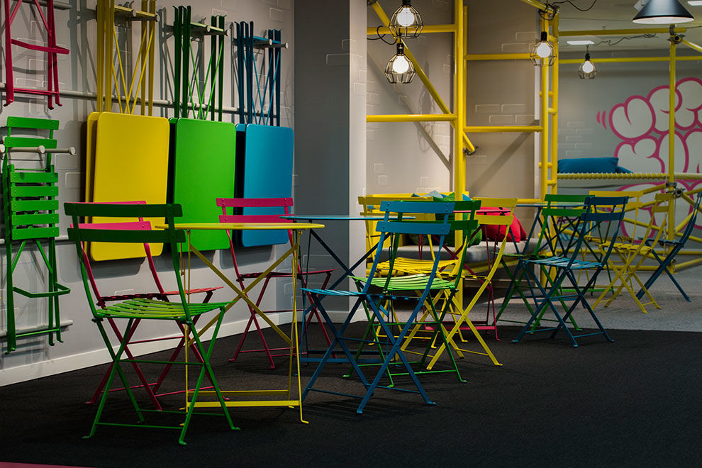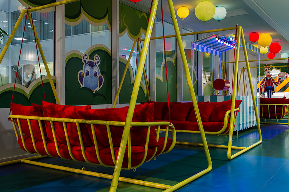 這里的一切與我們常見的辦公空間設(shè)計案例不太一樣,顏色、形狀、布局都跳脫出了辦公空間的慣有模式,高飽和度的明麗色調(diào)、充滿親和力與童話色彩的家具風(fēng)格,使得它看上去更像是一個專門為孩童設(shè)計的空間,包括蛋形的前臺、旋轉(zhuǎn)木馬樣式的用餐具、蹦床一般的座位等。