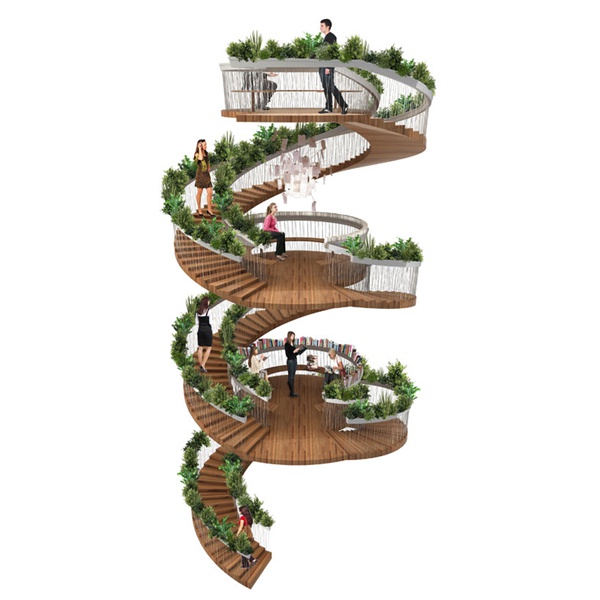 樓梯不僅僅是個過渡區(qū)域,還可以兼?zhèn)淦渌δ埽热缈罩谢▓@。在倫敦的一處辦公區(qū)域里,設(shè)計師把承重柱在中間的傳統(tǒng)樓梯變成螺旋結(jié)構(gòu)的The Living Staircase,沿著欄桿種滿植物,還設(shè)有圓形平臺,成為可以讓上班族在此休息放松的公共區(qū)域。設(shè)計源自 Paul Cocksedge Studio。