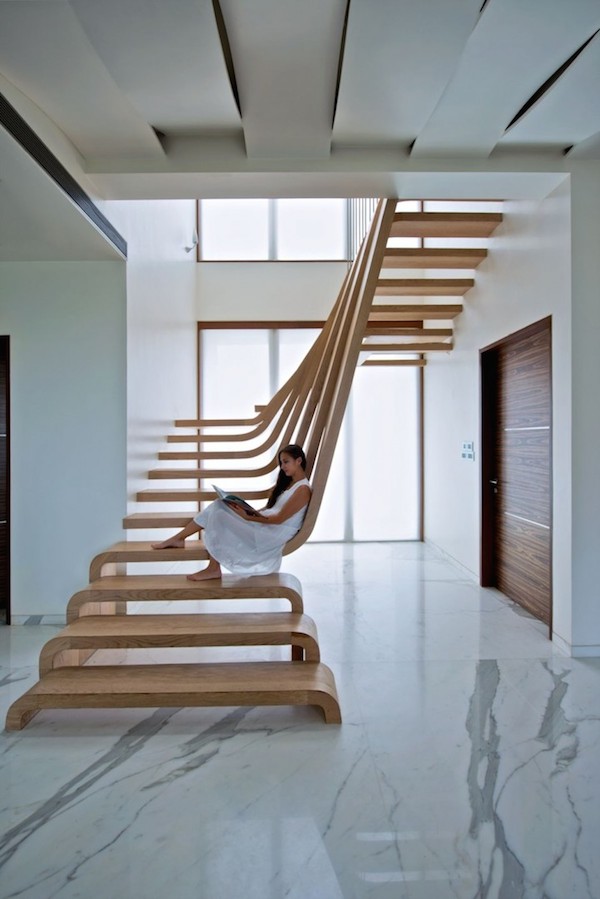 建筑師工作室Arquitectura en Movimento Workshop設(shè)計的樓梯,美輪美奐,少了扶手,卻多了連接上下梯面的木板,爬起來舒服,看起來也順眼,而且室內(nèi)的透光性更好,使用者可以隨意的坐在樓梯上,并且以延伸面做為椅背,圓弧的角度看起來十分舒適。