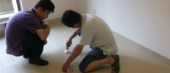 ③瓷磚要鑲平,角度要準(zhǔn)確,接口要對(duì)線,廁所地面要有斜面,不可積水,瓷磚接口掃白水泥后要用藤絲刷凈白水泥,不可在上面留污漬;