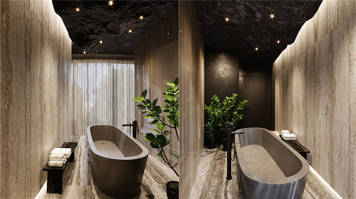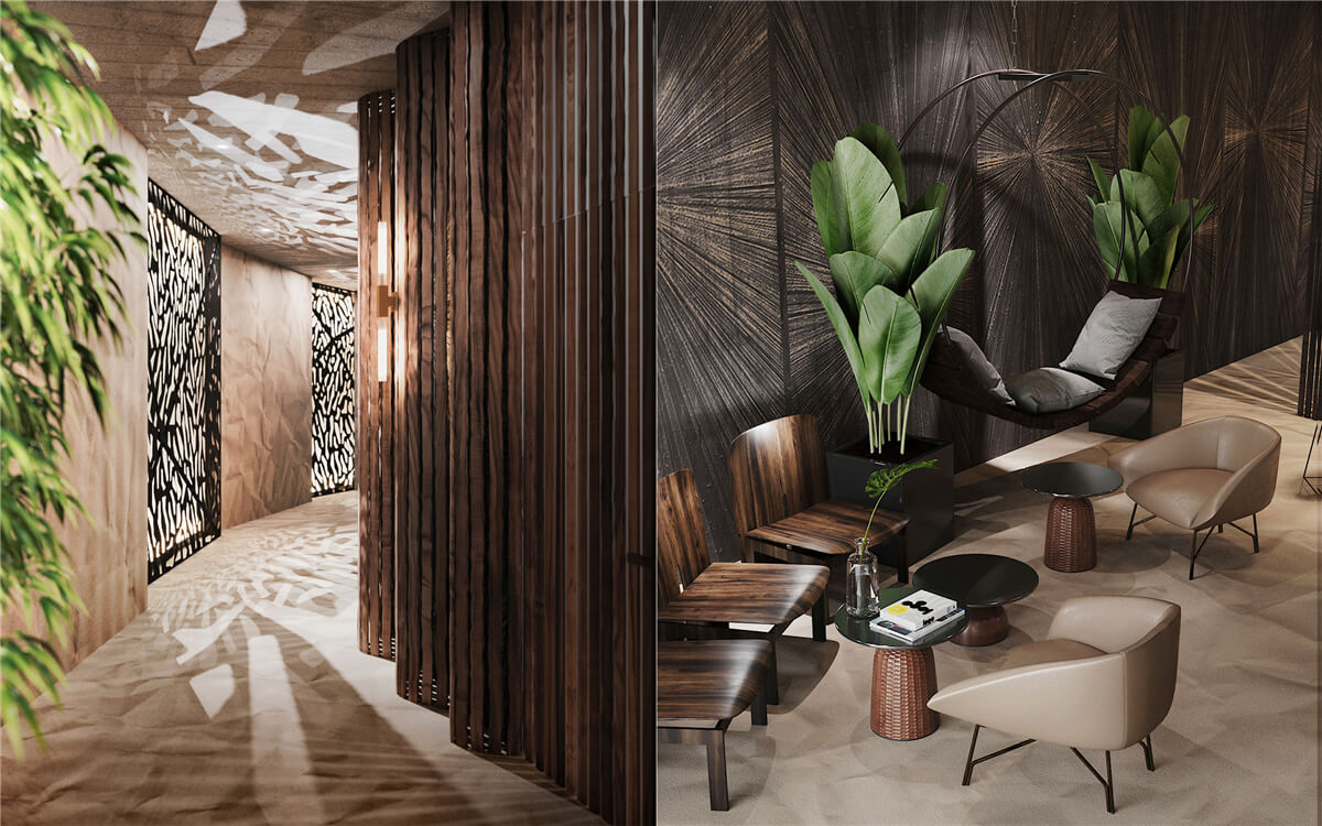 大自然穿透了復雜的內部空間,創(chuàng)造了令人愉悅的和諧空間。在S + S概念中,使用自然圖案和材料以及帶紋理的元素進行對比。就像在自然界中一樣,一種元素可以平滑地轉變?yōu)榱硪环N元素–這營造了輕松的氛圍,并增強了客人與環(huán)境的聯(lián)系。亞洲藝術和圖案成為設計的標志。私密的燈光,裝飾中的質感元素和諧地融入自然室內。對于飾面,設計師選擇了深色,深色陰影的木材和天然石煤以及類似于周圍懸崖的清晰銳利線條。